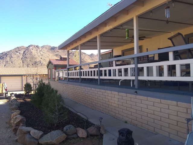 Home Surrounded with mountains on three sides and a view looking at the valley is just one of the many futures. This 3 Bedroom, 2 Bath Home was completely renovated approximately 4 years ago; new roofing, new exterior and interior paint throughout, new patios on sides and rear, plus a existing 12\' x 60\' covered full length patio in front. a new kitchen w/all new cabinets, stainless steel appliances, including washer and dryer, new carpet through out, new laminated flooring in bathrooms and kitchen, new bath room vanity, toilet, new evaporative cooler and air conditioners, private back yard garden area w/ fruit trees w/entry to hot tub room and master bedroom, additionally there\'s a 24\' x 30\' shop with 24\' x 16\' shed roof over cement parking area off to one side, plus a separate carport as well, property is partially fenced with drive way gates and landscaped w/ palm trees oleanders, desert trees, there\'s a fully functional greenhouse and additional garden area w/water system. Heating is propane fireplace Cooling is Evaporation and built in air conditioners Home is ready for HVAC system with gas, electric and duct work in place w/electrical disconnect outside for condenser.